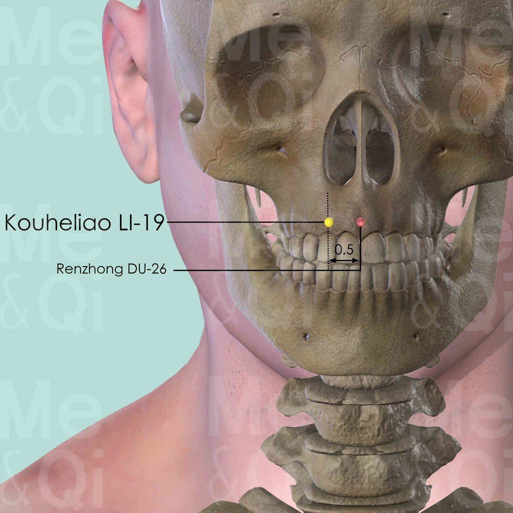 Divide the distance between the nostril and the upper lip into three section. Renzhong DU-26 is located on the anterior midline, at the junction of the upper and the middle third. Kouheliao LI-19 is at the same level as DU-26, 0.5 cun lateral to it.