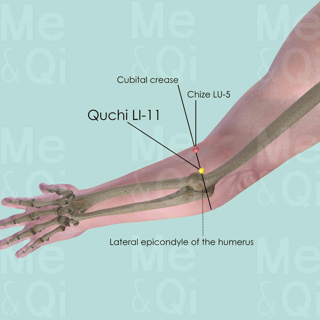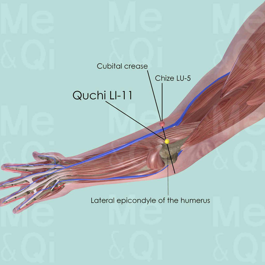When the elbow is flexed, Quchi LI-11 is in the depression at the lateral end of the cubital crease, midway between Chize LU-5 and the lateral epicondyle of the humerus.
