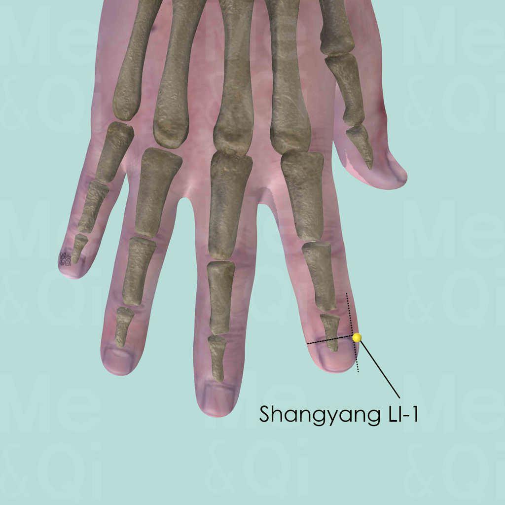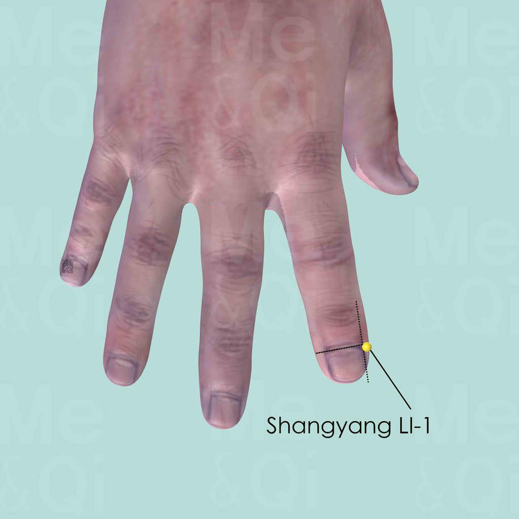 Shangyang LI-1 is located at the junction of two tangents along the proximal and medial borders of the index finger. 0.1 cun from the actual margin of the nail.