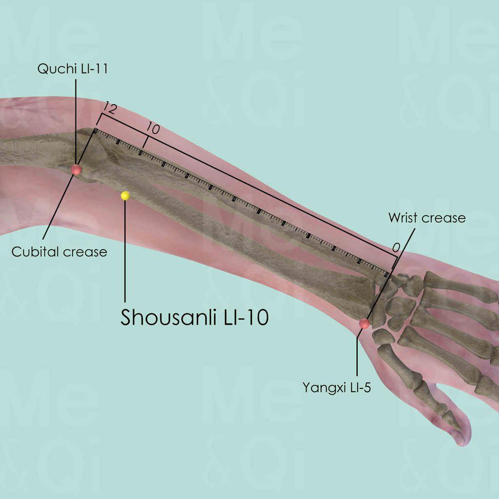 Shousanli LI-10 is a major point of the Large Intestine Channel. It is widely used to treat intestine disorders such as abdominal pain, vomiting or diarrhoea.