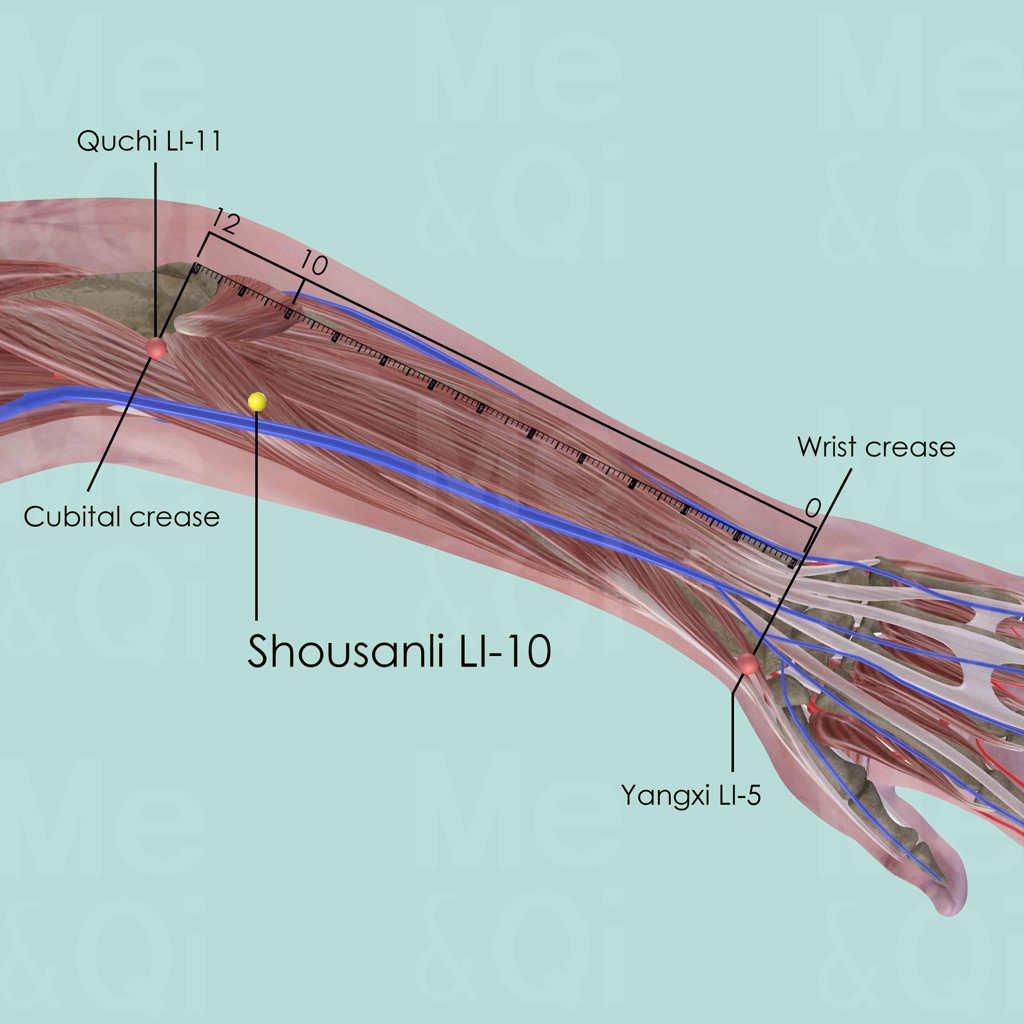 With the hand supinated, the line connecting Yangxi LI-5 and Quchi LI-11 runs alongside the radial margin of the forearm. However, with the arm pronated, it transverses the forearm. The forearm is recommended to be in a midposition with flexed elbow. Shousanli LI-10 is located 2 cun distal to Quchi LI-11 on the line connecting Yangxi LI-5 and Quchi LI-11.