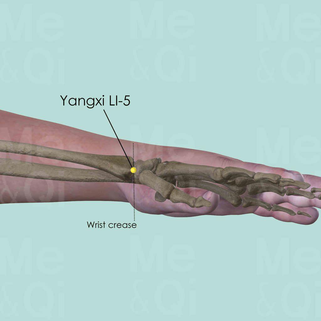 Hold the hand in a horizontal position and abduct the thumb. Yangxi LI-5 is located on the wrist joint space (wrist crease) in the depression between the tendons of extensor pollicis longus and brevis muscles. It is more palpable by moving the wrist.