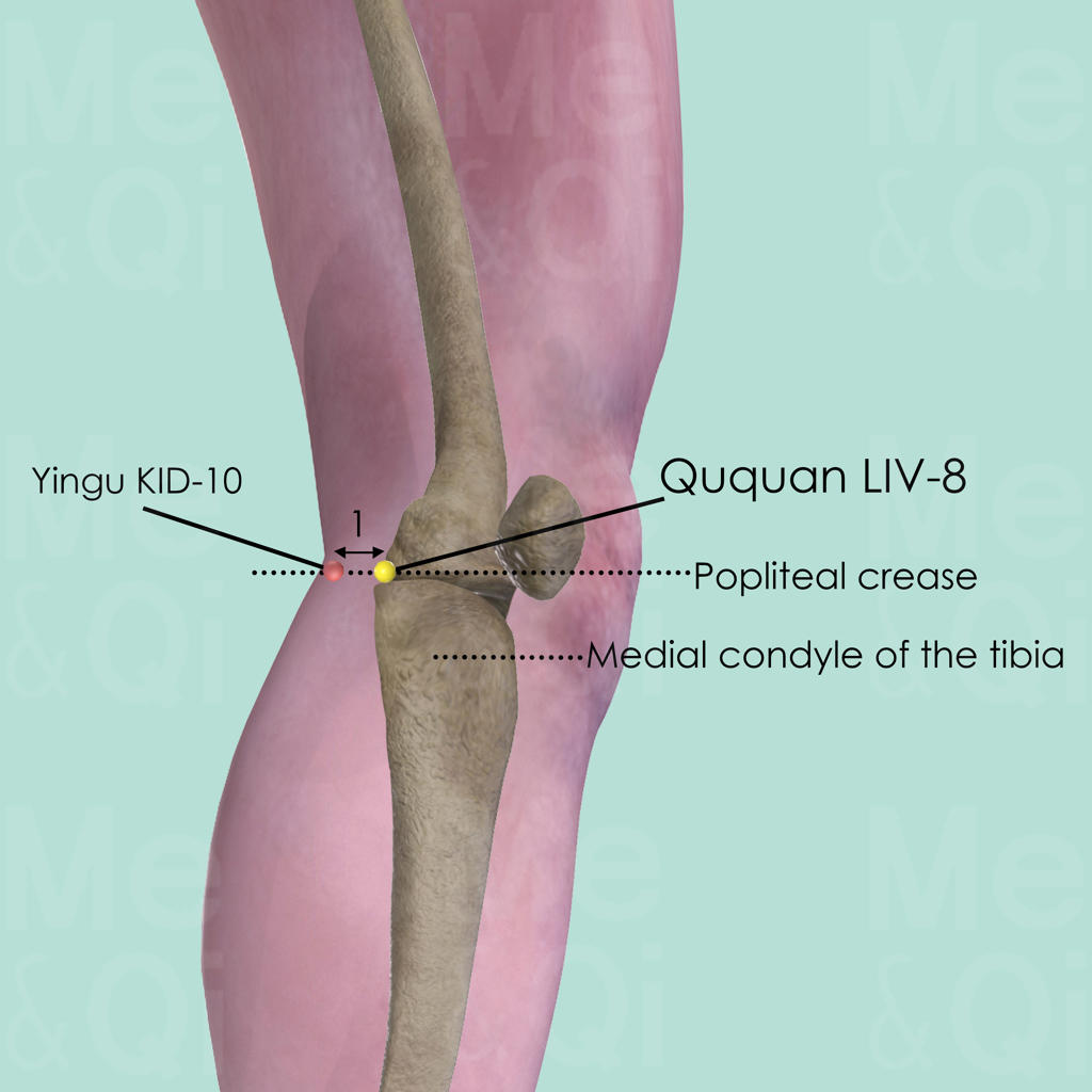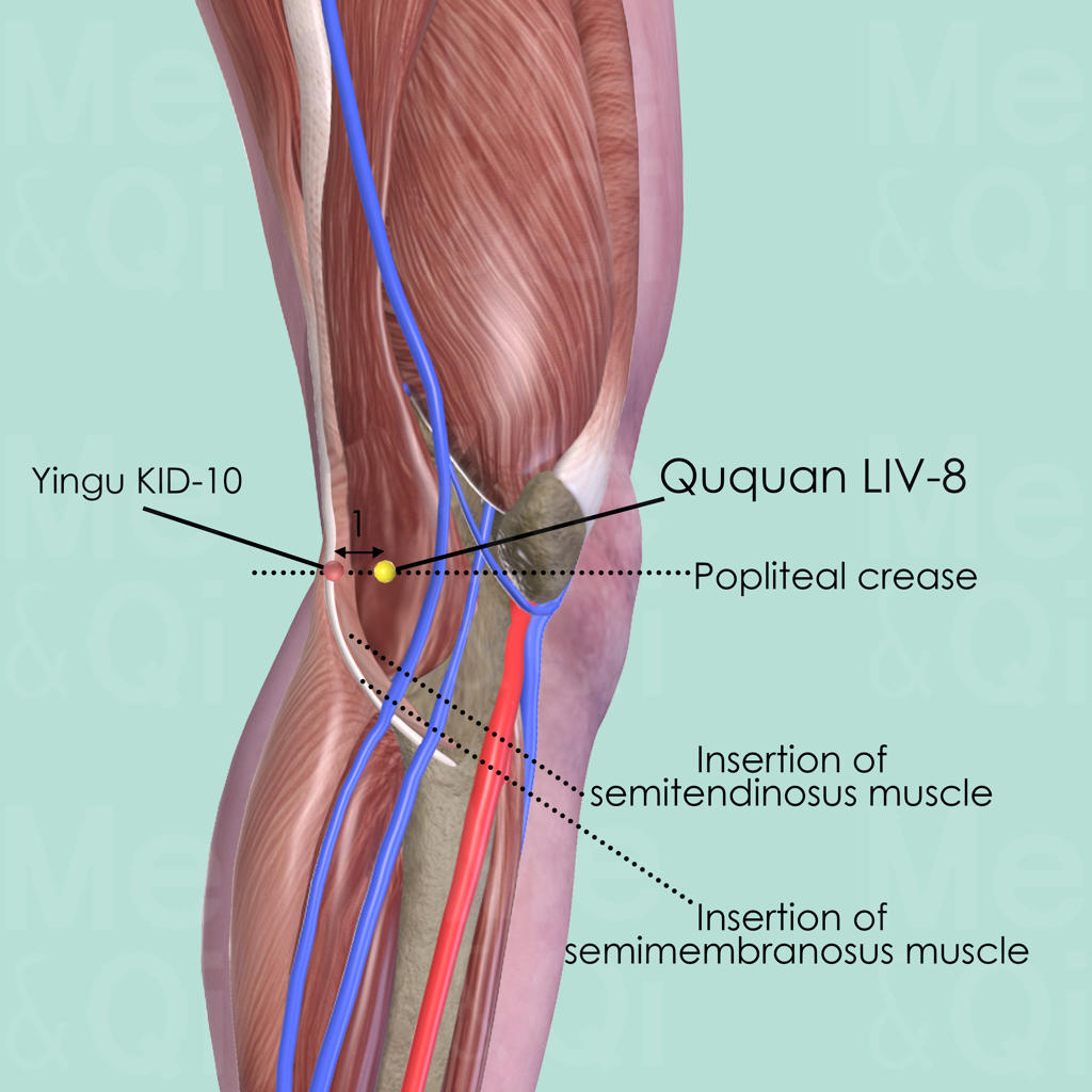 On the medial aspect of the knee join. Flex the knee and locate the point above the medial end of the popliteal crease, posterior to the medial condyle of the tibia, on the anterior border of the insertion of semimembranosus and semitendinosus muscle, about 1 cun anterior to Yingu KID-10.