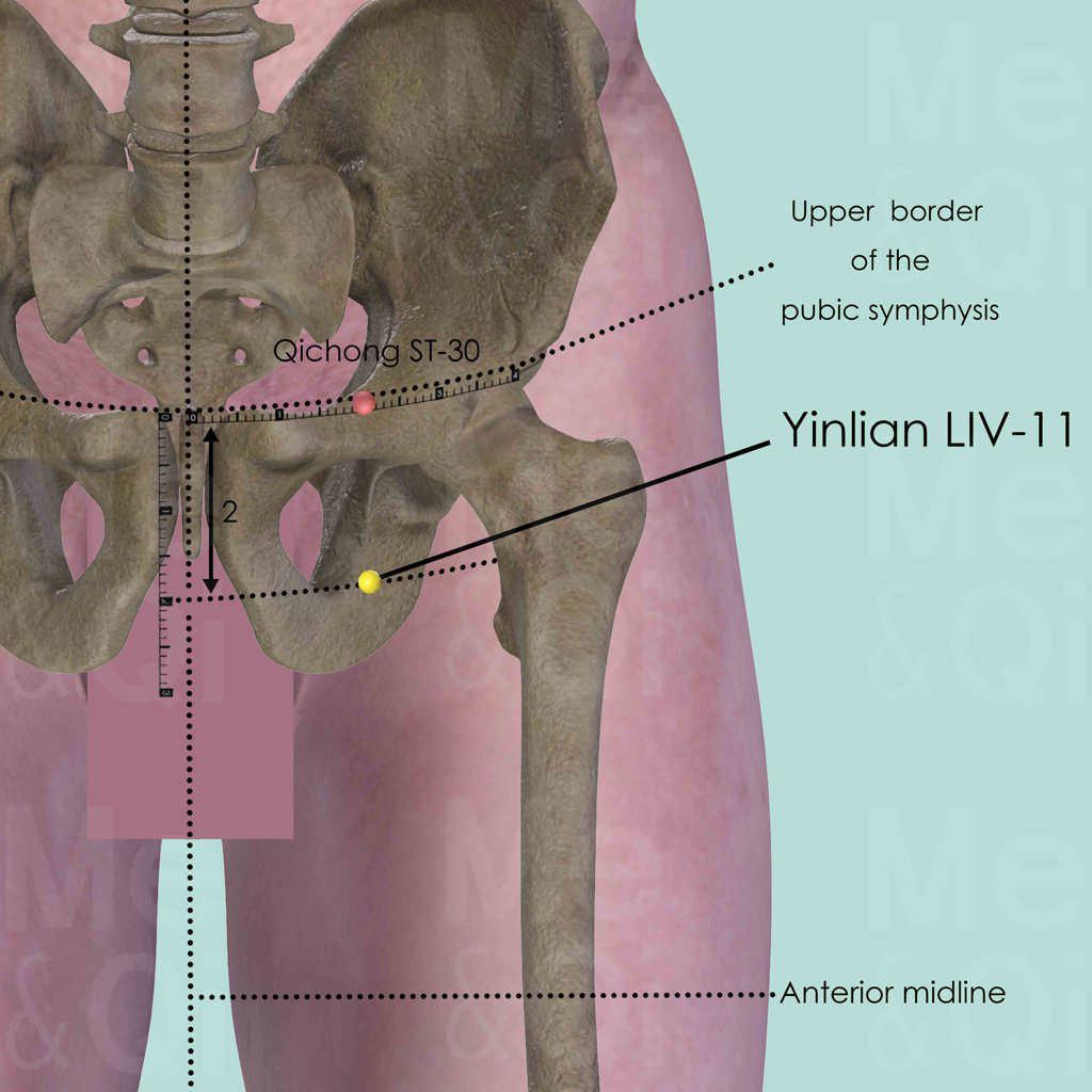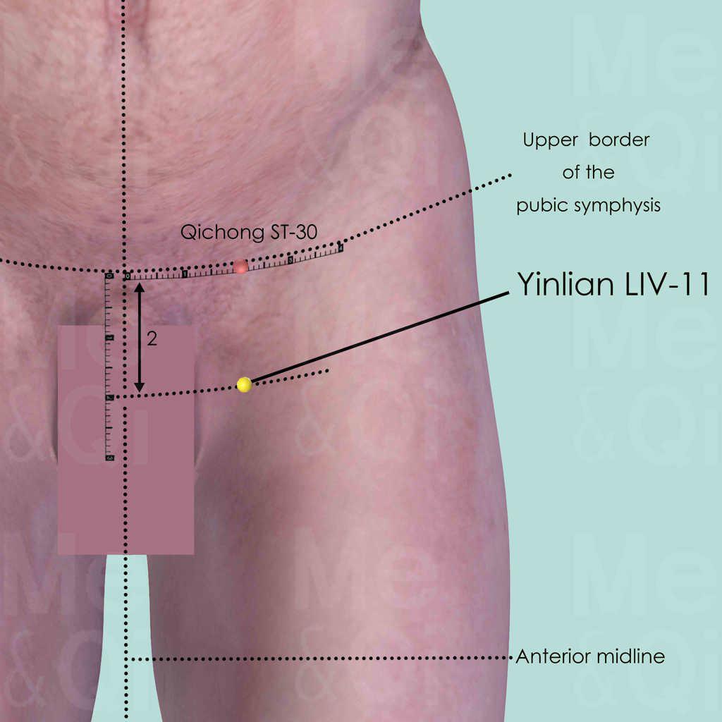 Flex the adductors by pressing feet against each other. Locate LIV-11 2 cun inferior to the upper border of the pubic symphysis and 2 cun lateral to the anterior midline.