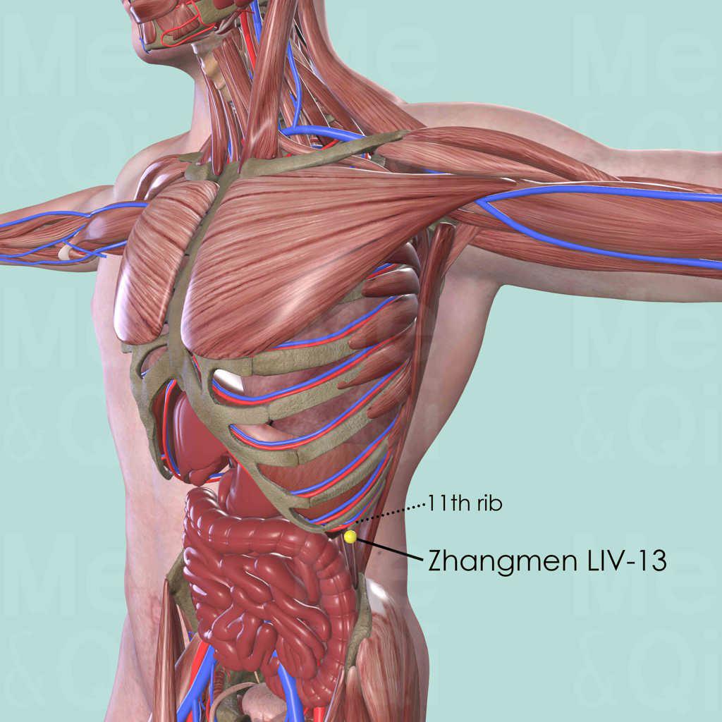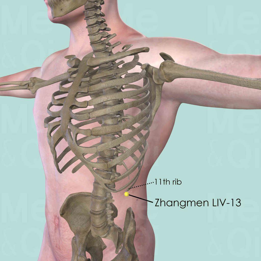 Press the flexed elbow at 90 degree against the lateral aspect of the thorax, so that the tip of the olecranon points to the free end of the 11th rib. Or palpate along the lower border of the rib cage until finding the free end of the 11th rib. LIV-13 is located on its anterior and inferior border.