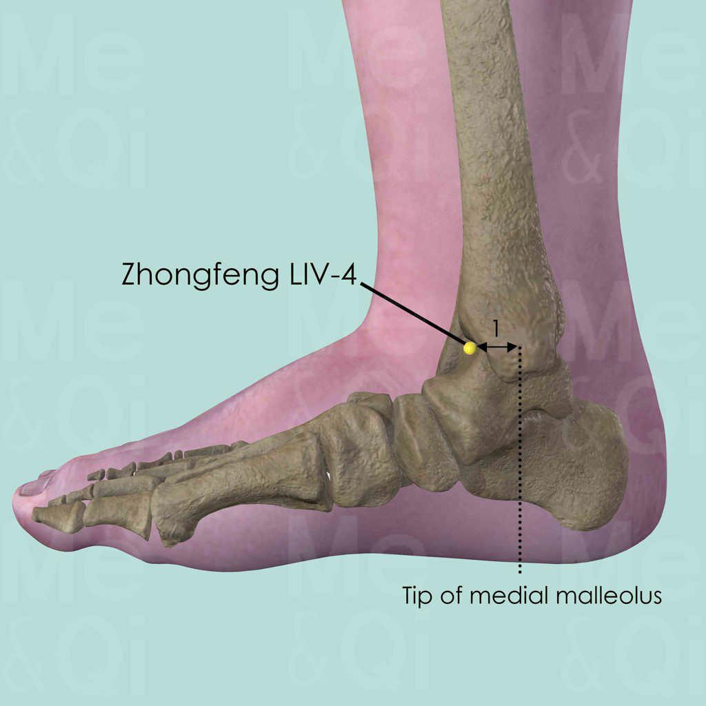 With slight ankle dorsiflexion, the tendon of the tibialis anterior muscles becomes more pronounced on the medial aspect of the ankle. Zhongfeng LIV-4 is located in the depression between the tendon and the tip of the medial malleolus.
