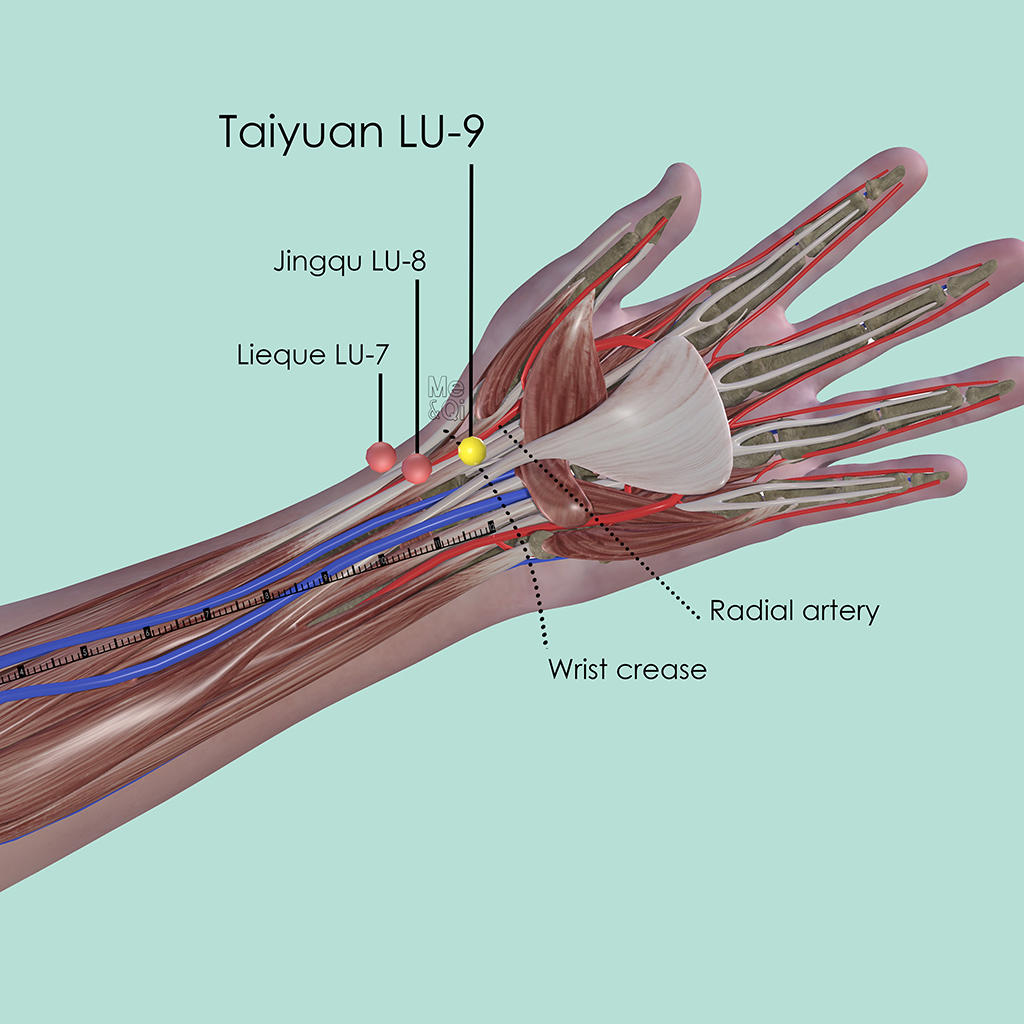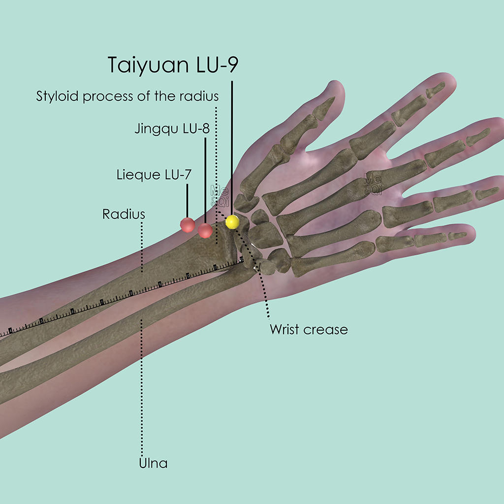 Taiyuan LU-9 is one of the main points of the Lung Channel. It is more used for chronic, Deficient/Empty and Interior patterns, especially in the case of Lung Qi or Yin Deficiency. Nevertheless, it can still treat acute, Excess/Full or Exterior patterns, but less frequently.