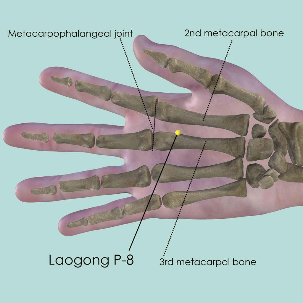 Make a loose fist and locate Laogong P-8 at the tip of the middle finger, between the 2nd and 3rd metacarpal bones. The point is slightly closer to the 3rd metacarpal bone.