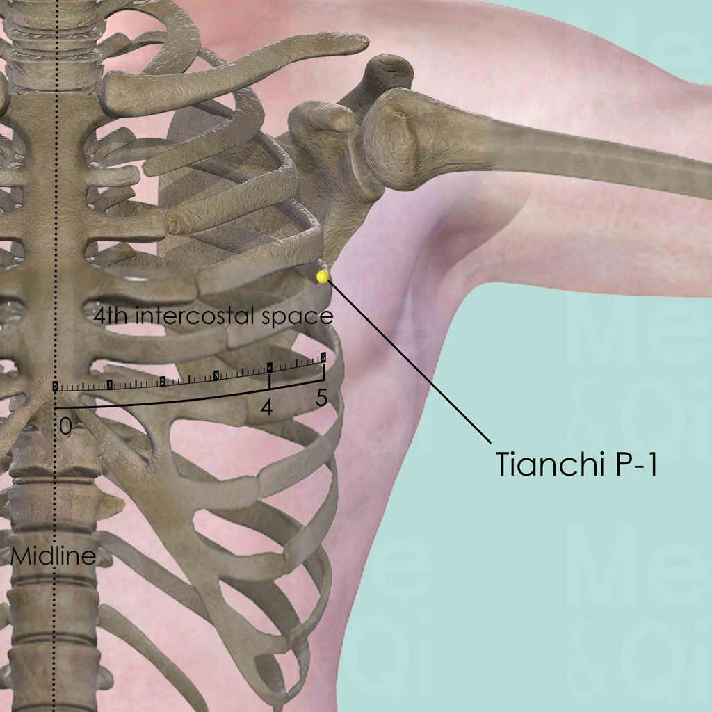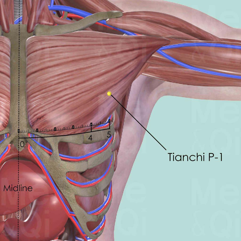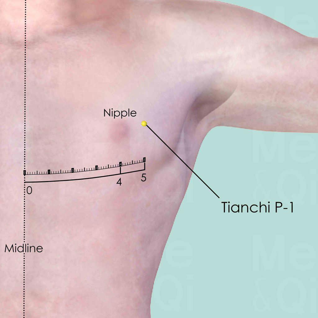 Locate Tianchi P-1 1 cun lateral to the nipple in the 4th intercostal space, which is on the same level of the nipples.