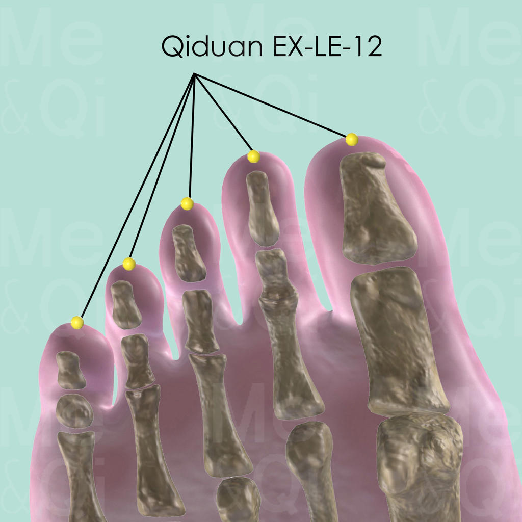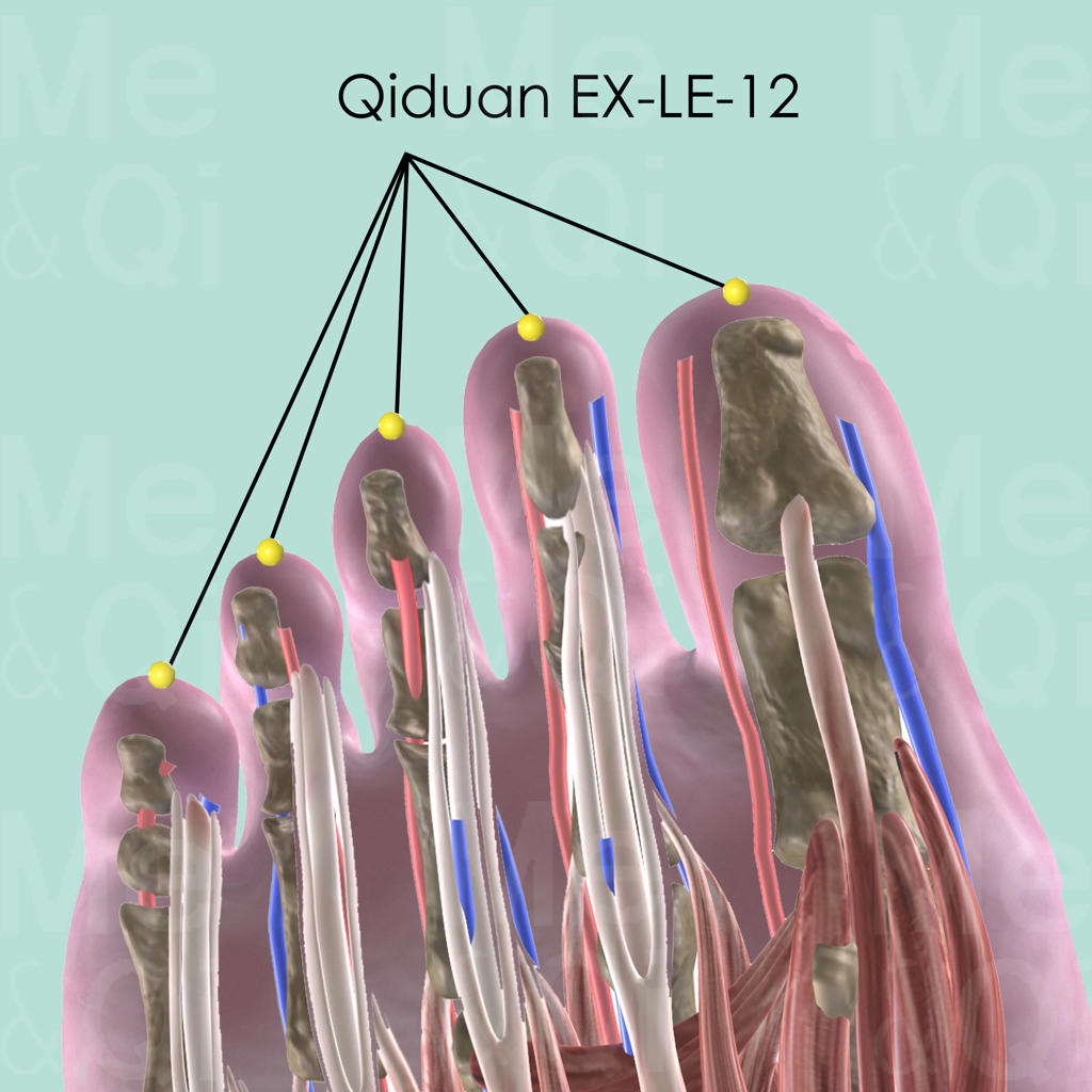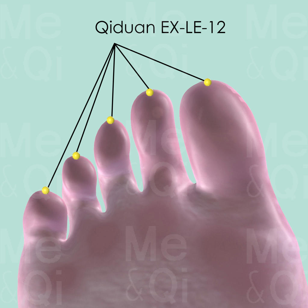 Research published in Zhongguo Zhen Jiu (Chinese Acupuncture & Moxibustion) notes that "Qiduan (EX-LE 12) is also named as foot-Shixuan" and can be "combined with Qiduan (EX-LE 12) in the emergent treatment of tense syndrome and syncope." The point shares functional similarities with the twelve jing-well points in its ability to clear heat and restore consciousness.