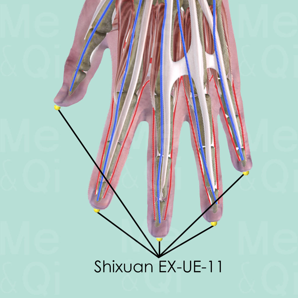 This is a set of 10 points (one at each fingertip), not a single point. Bloodletting should be performed with proper sterilization using a sterile lancet or three-edged needle. Avoid in patients with bleeding disorders, those on anticoagulant therapy, or in cases of severe anemia. The fingertips are highly sensitive with dense nerve endings - warn patients of the sharp sensation. In pediatric patients, use minimal stimulation. While traditionally used for emergency revival, modern practice should integrate this with appropriate medical care - bloodletting at Shixuan is a first-aid adjunct, not a replacement for professional emergency treatment of stroke or seizures.