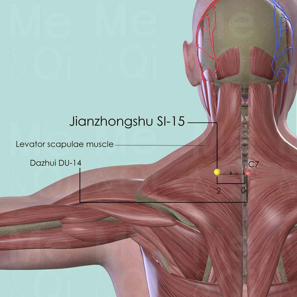Similar to Quyuan SI-13 and Jianwaishu SI-14, Jianzhongshu SI-15's main function is to open the Channel by removing the Obstruction. Therefore, it is able to treat symptoms like pain in the shoulder and scapula. However, it is less frequently used comparing with the two neighboring points.
