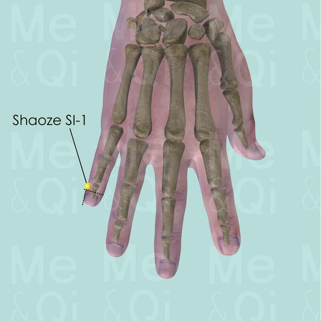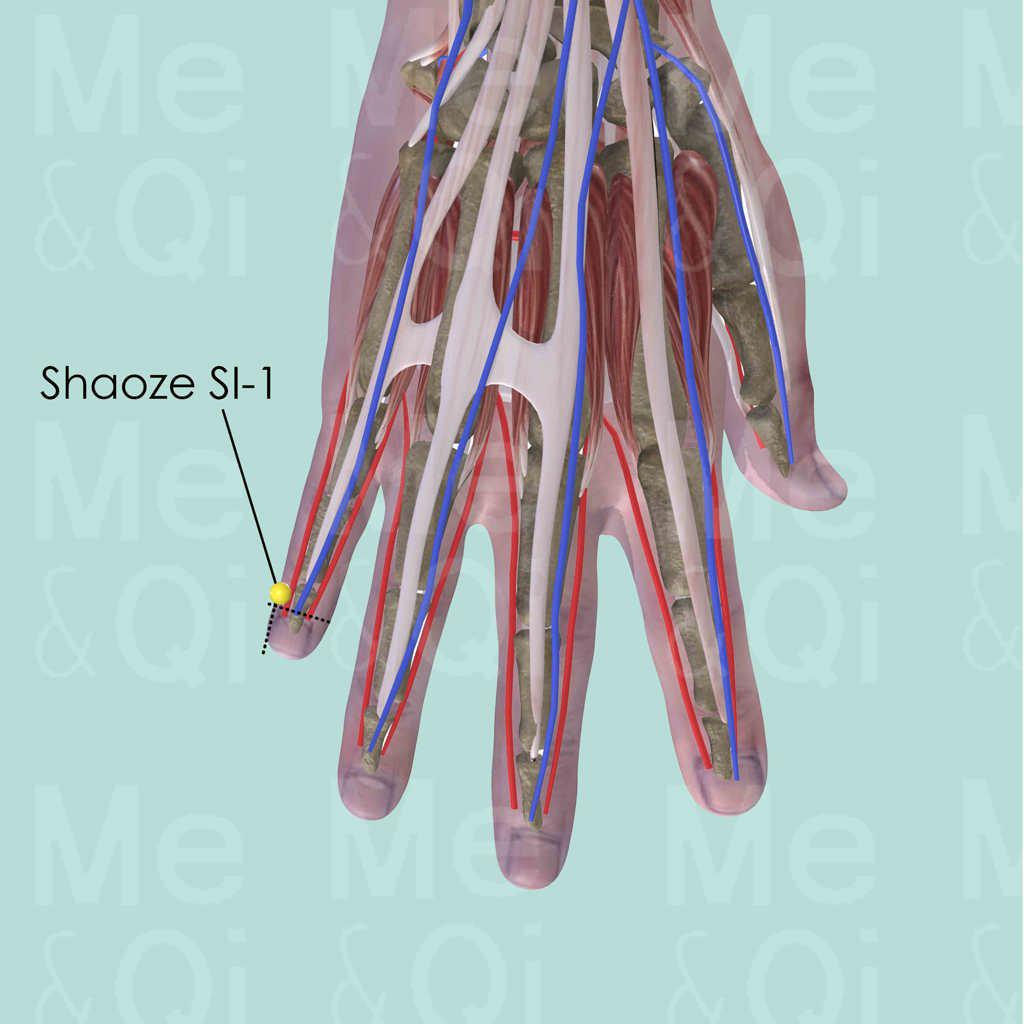 Shaoze SI-1 is located at the junction of the lines drawn along the ulnar and bottom border of the nail, about 0.1 cun from the corner of the nail. Shaochong HE-9 is located on the other corner of the nail.