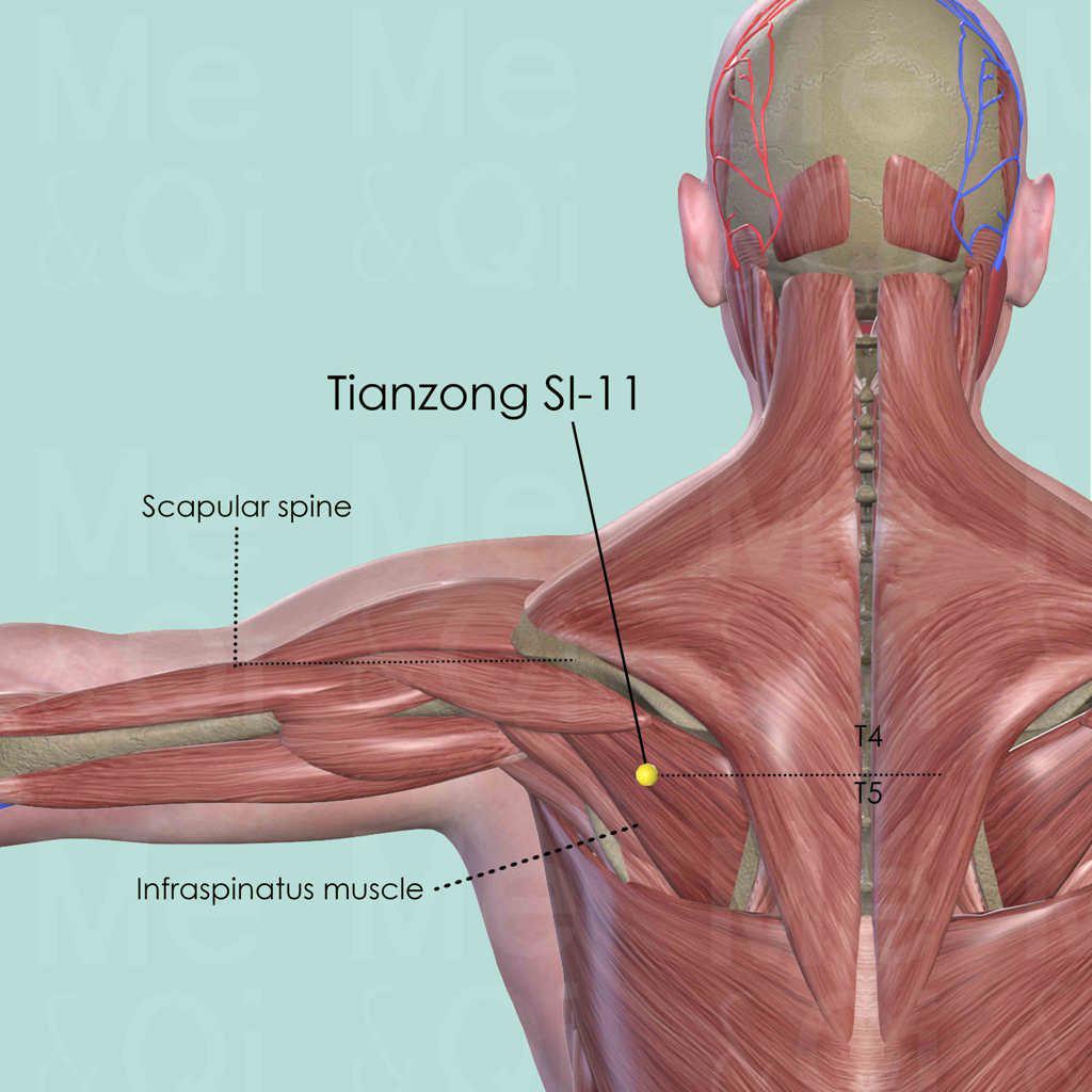 The patient is better to be seated in a relaxed way with arms hanging down. Draw an imaginary line from the midpoint of the scapular spine to the inferior angle of the scapula. Tianzong SI-11 is located at the junction of the upper and middle third of this line, in a depression on the infraspinatus muscle, which is often sensitive to pressure. Also, Tianzong SI-11 is generally at the same level as the gap between the 4th and the 5th spinous process (T4 and T5).