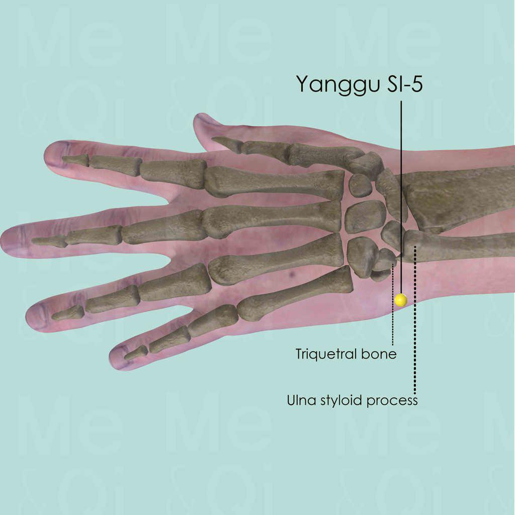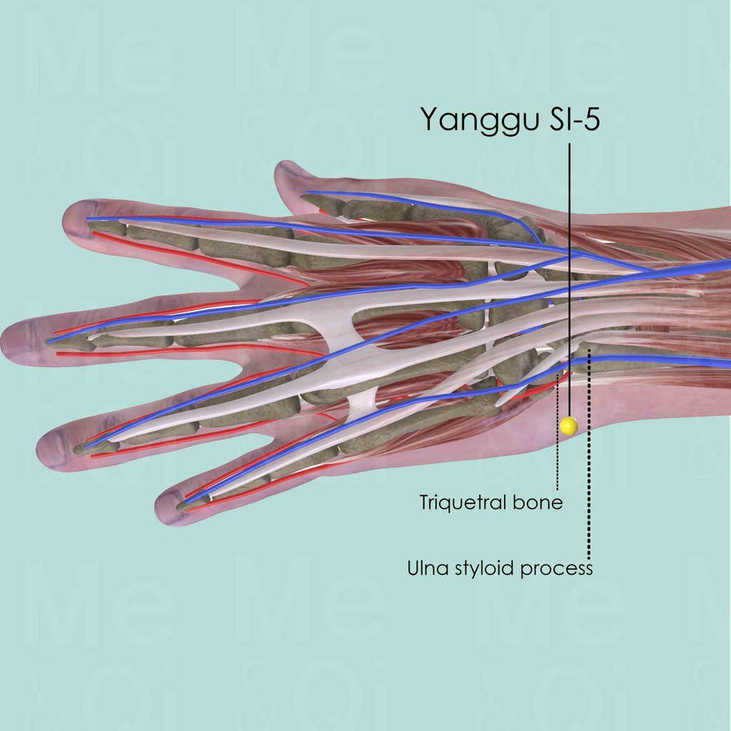 On the ulnar side of the hand, palpate the wrist joint space and locate Yanggu SI-5 in the depression between the styloid process of the ulna and the triquetral bone.