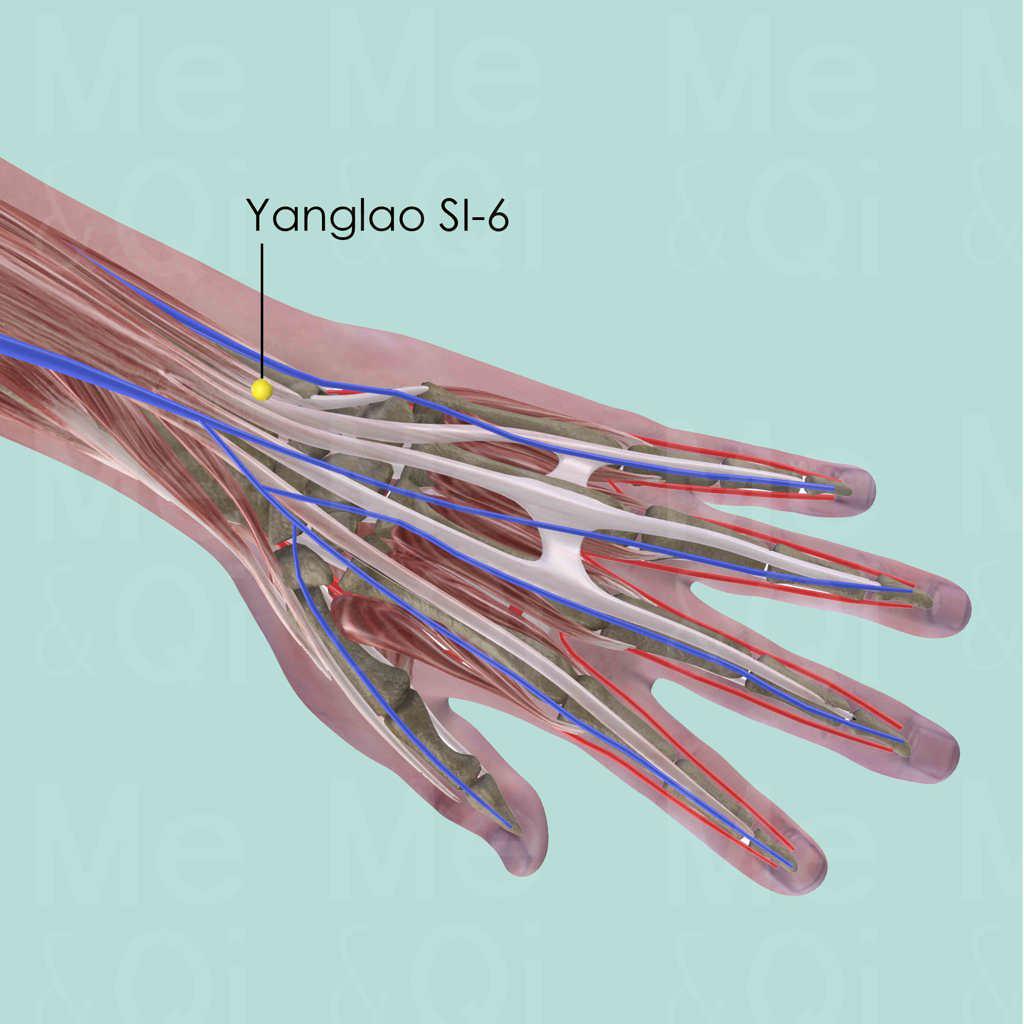 Dorsal to the head of the ulna. When the palm faces the chest, Yanglao SI-6 is in the bony depression on the radial side of the styloid process of the ulna.