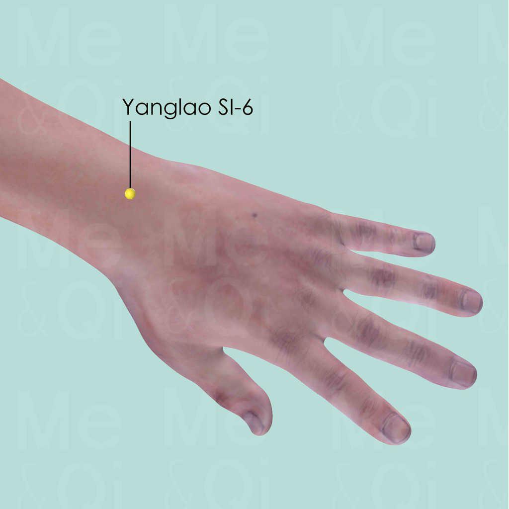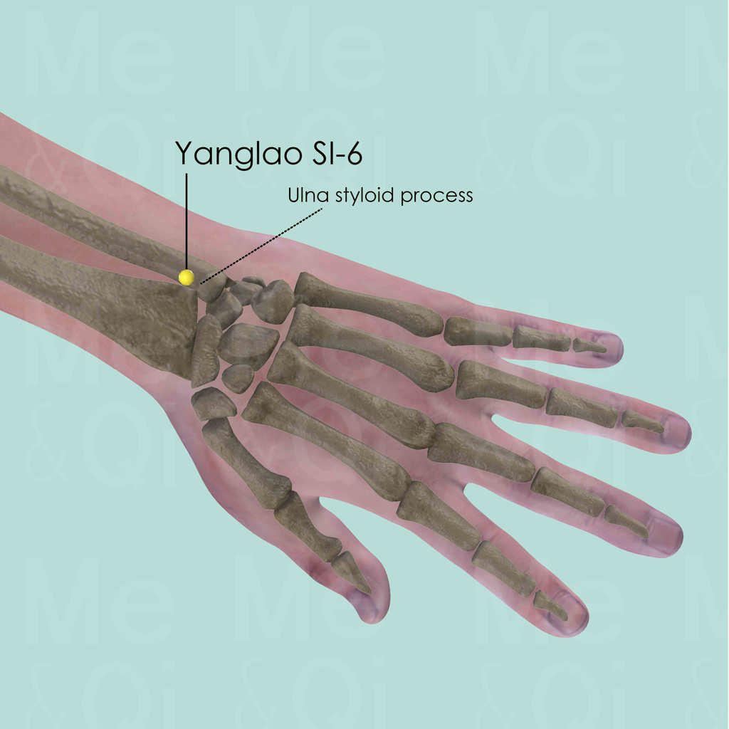 "Yanglao, the Xi-Cleft point of Hand Taiyang, is located in a depression one cun proximal to the wrist, above the ankle bone of the hand [ulnar styloid]."