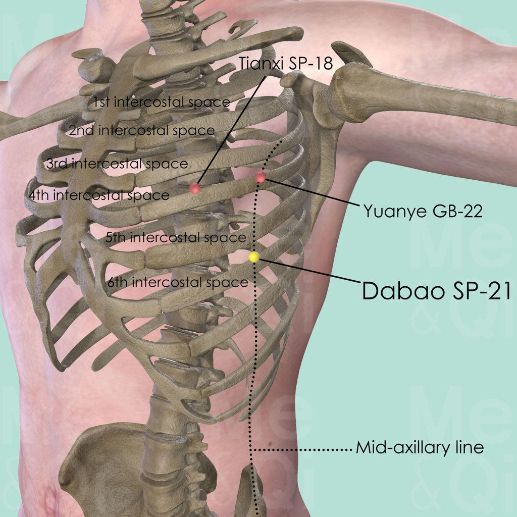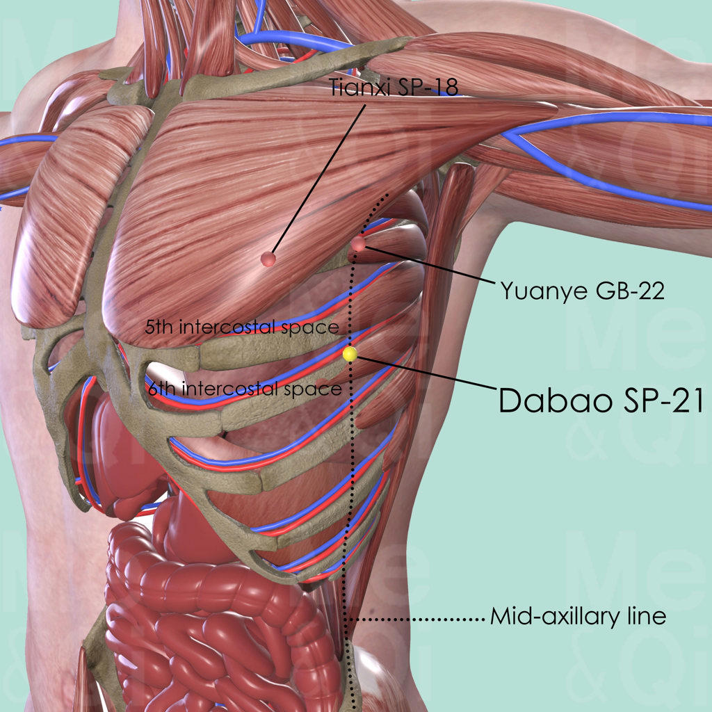 Dabao SP-21 is the starting point of the Great Luo-Connecting Vessel of the Spleen, which then spreads over the chest and ribs. Therefore, it invigorates Qi in the chest.