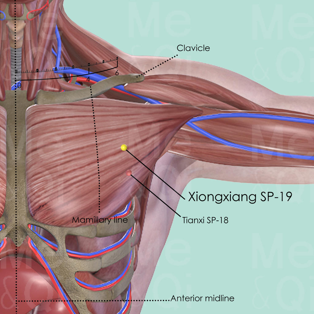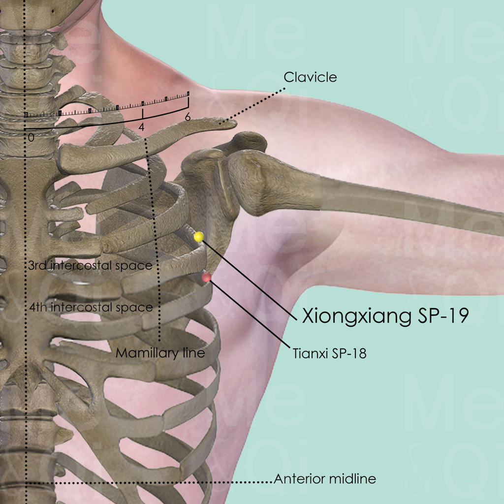 The nipples usually falls into the 4th intercostal space, which is the same level at Tianxi SP-18. Identify the 3rd intercostal space by counting 1 space up, or 2 spaces down from the clavicle. Xiongxiang SP-19 is on the 3rd intercostal space and 6 cun lateral to the anterior midline (or 2 cun lateral to the mammillary line).