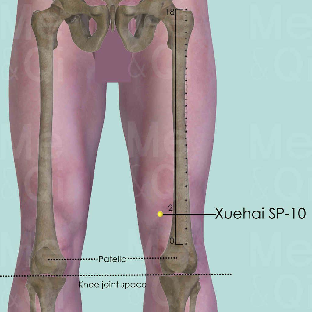 When knee is flexed, Xuehai SP-10 is 2 cun above the medial upper border of the patella, in a depression on the vastus medialis muscle.