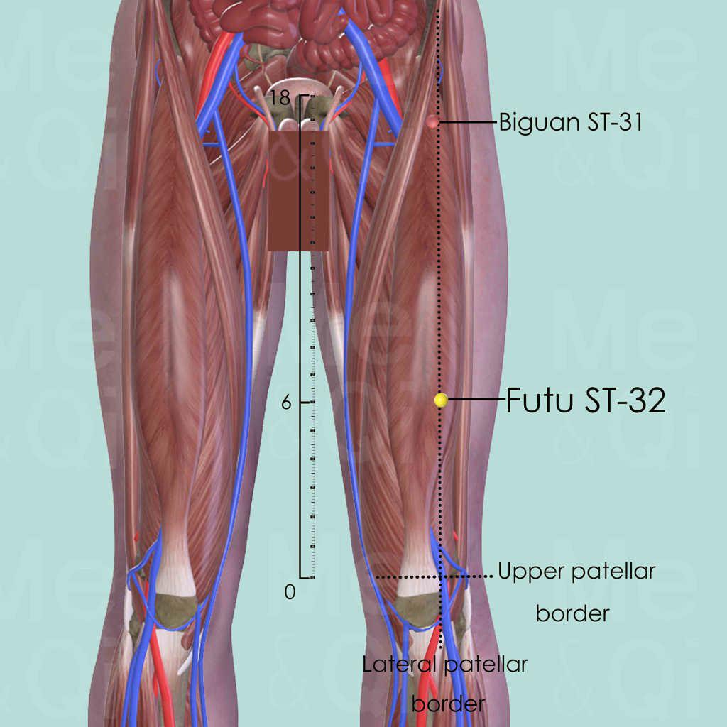 Like its neighboring point Biguan ST-31, Futu ST-32 is also indicated for Painful Obstruction Syndrome, Atrophy Syndrome or sequelae of Wind-stroke, particularly of the legs. However, its effectiveness is less stronger.