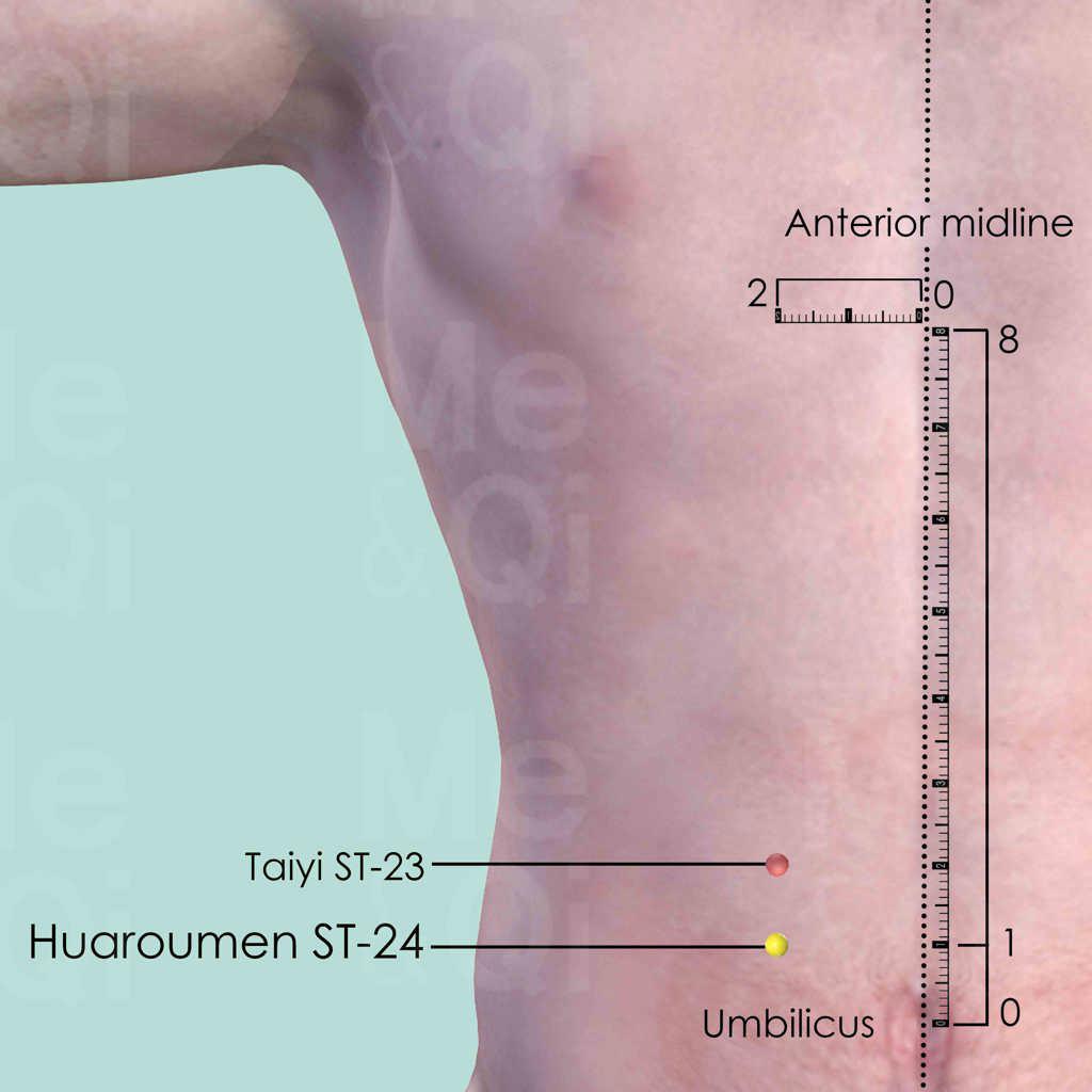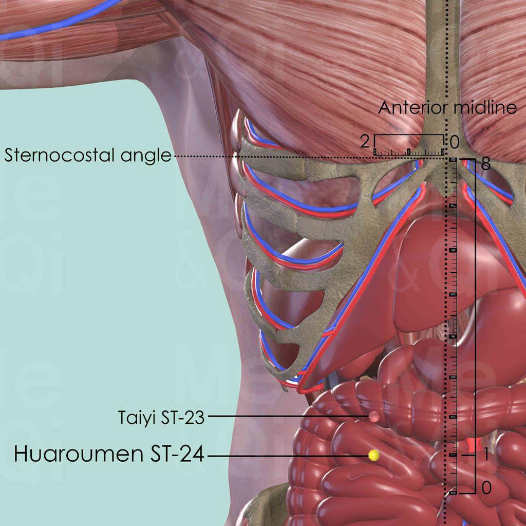 There are 8 cun between the sternocostal angle and the center of the umbilicus. Huaroumen ST-24 is 7 cun below the sternocostal angle and 1 cun above the umbilicus. It is also 2 cun lateral to the anterior midline.