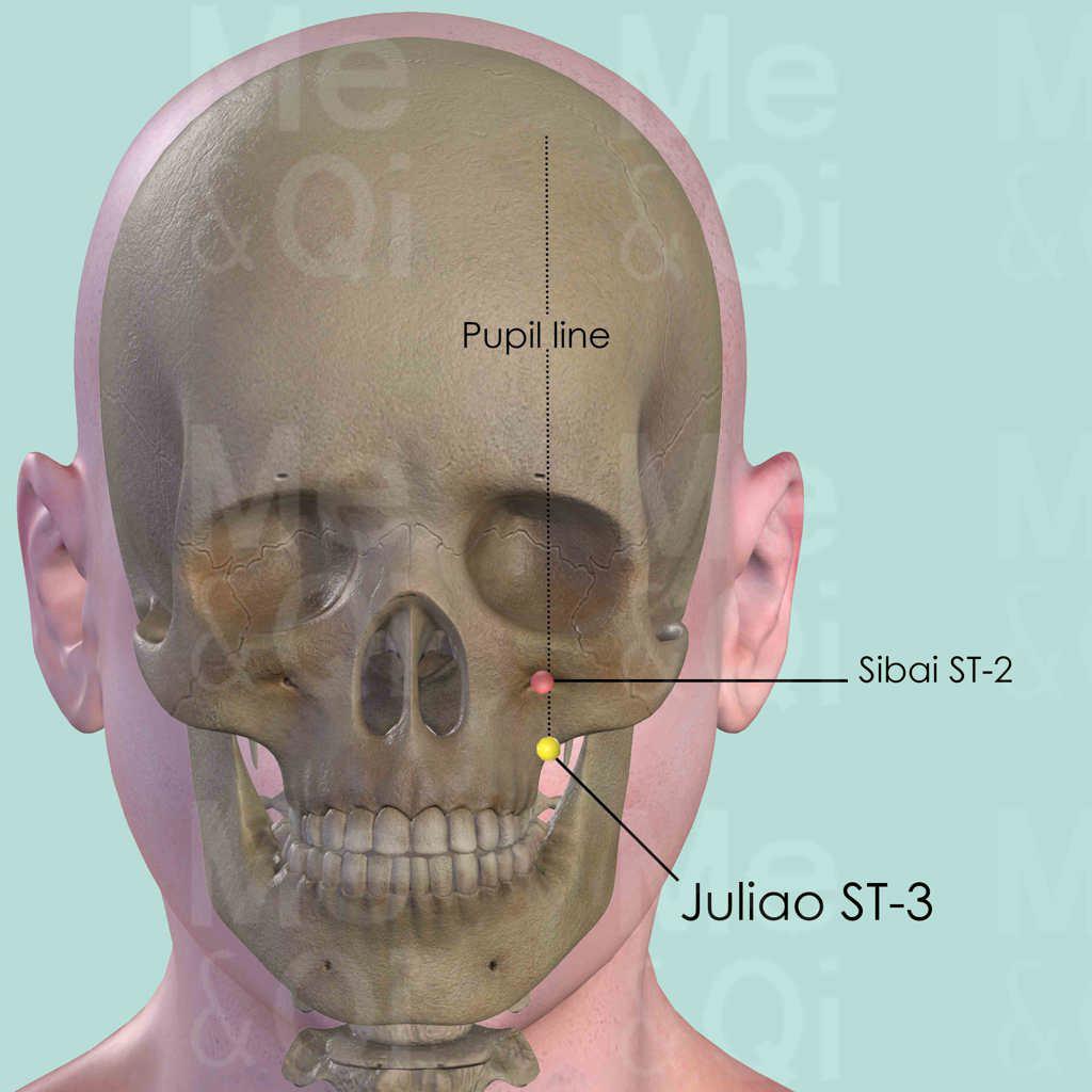 The first four points of the Stomach Channel are located vertically in the central pupil line, when the patients look straight ahead. Juliao ST-3 is located at the crossing point of the pupil line and a horizontal line on the level of the lower border of the ala nasi.