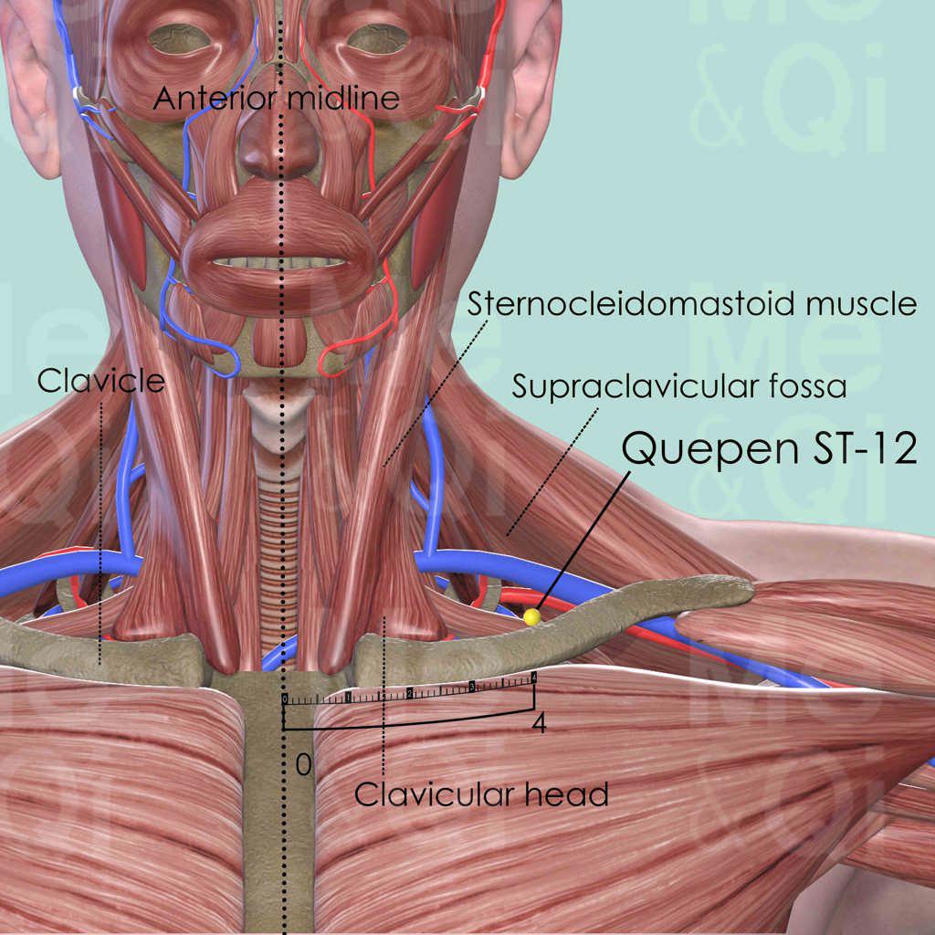 From the anterior midline, palpate 4 cun along the clavicle to the midpoint. Quepen ST-12 is located at the upper border of the clavicle in the supraclavicular fossa, lateral to the clavicular head of the sternocleidomastoid muscle.