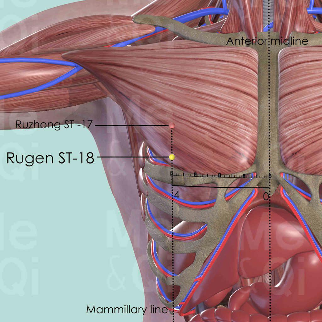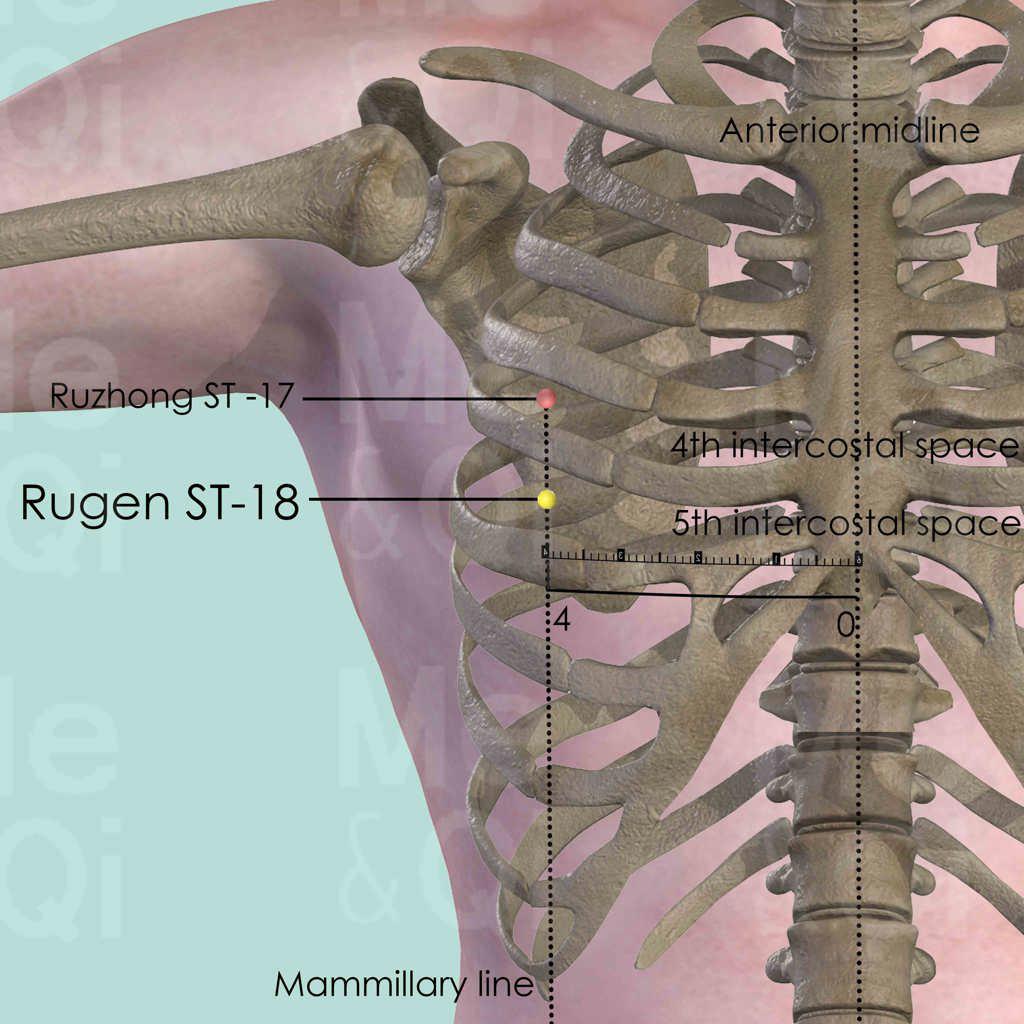 Rugeng ST-18 is locate on the mamillary line, which is 4 cun lateral to the anterior midline. The nipple (Ruzhong ST -17) is mostly located on the 4th intercostal space, while ST-18 is one intercostal space directly below the nipple. In women, ST-18 is normally found at the root of the breast.