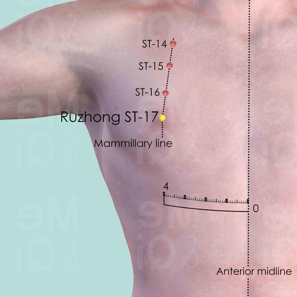 Contradicted for needling or any other type of therapies. Ruzhong ST-17 is only used for location reference.
