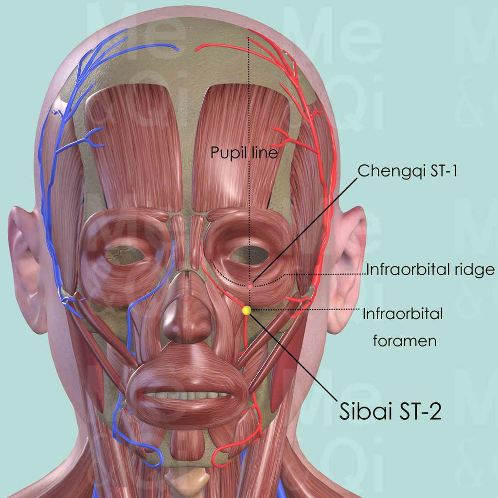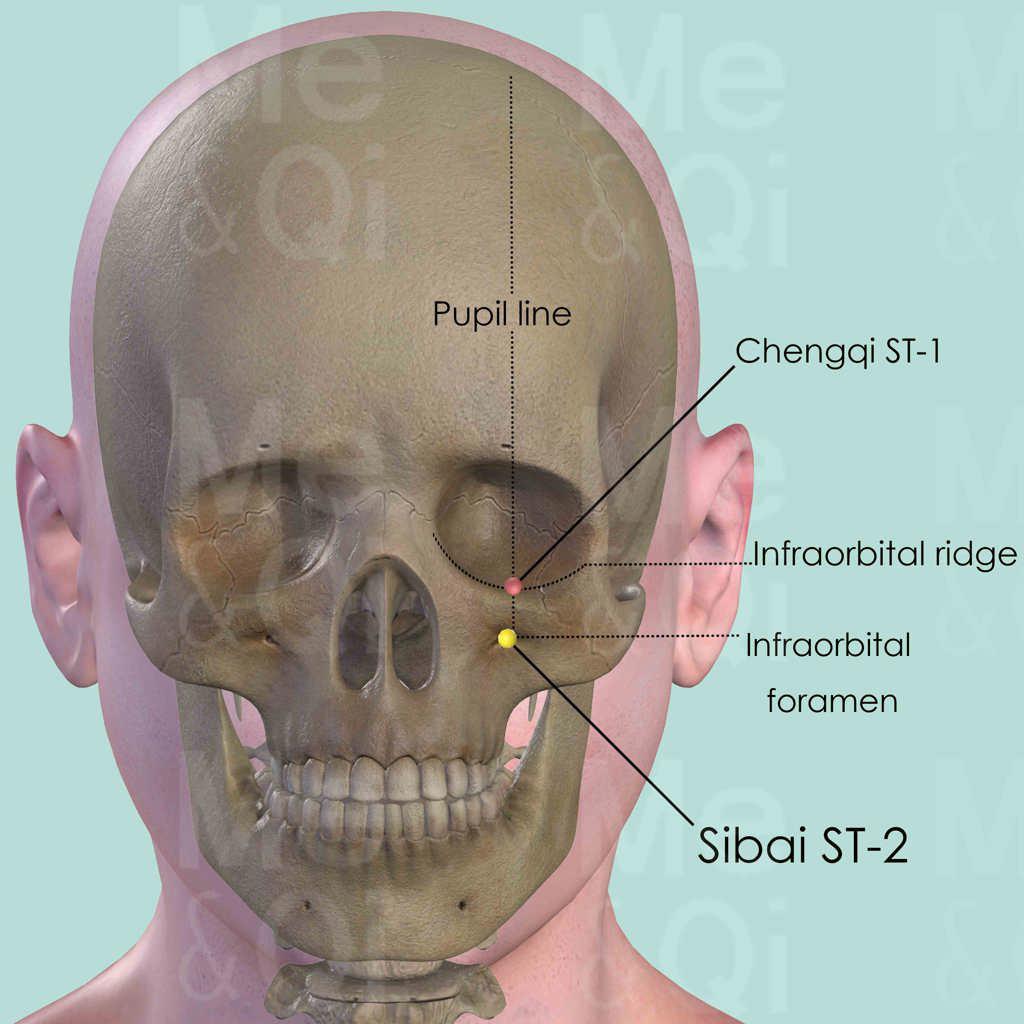 The first four points of the Stomach Channel are located vertically in the central pupil line, when the patients look straight ahead. The infraorbital ridge is an obvious bony structure under the lower eyelid. Sibai ST-2 is located in a depression inferior to the midpoint of the infraorbital ridge, at the infraorbital foramen.