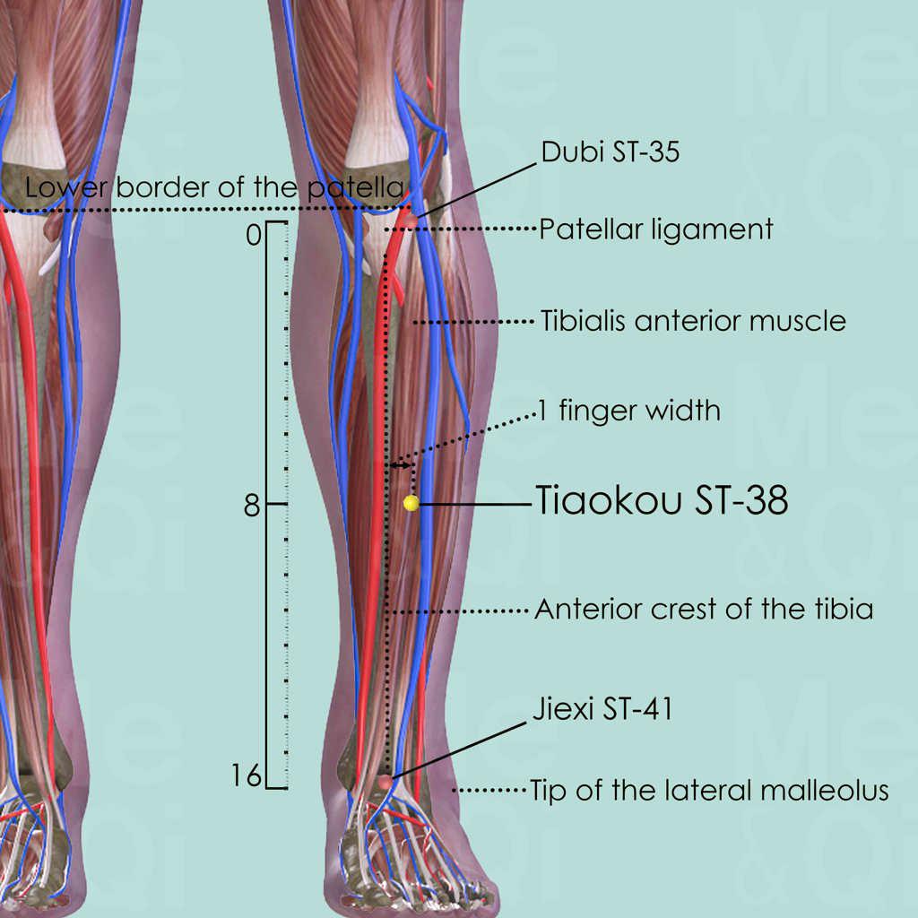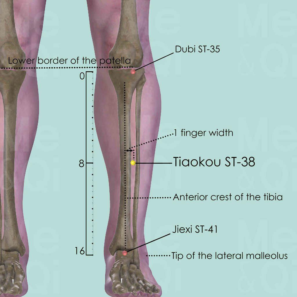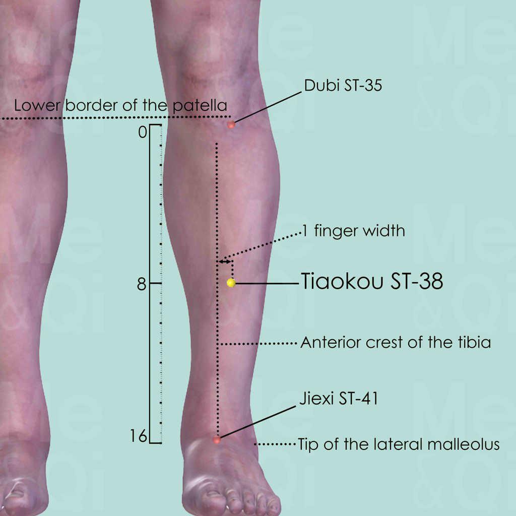 First locate Dubi ST-35 in the depression below the patella and lateral to the patellar ligament. Then locate Jiexi ST-41 in the depression between the tendons of the extensor digitorum longus and the hallucis longus, level with the tip of the lateral malleolus. Draw an imaginary line between these two points and locate Tiaokou ST-38 in the midway and one middle finger-width lateral to the anterior crest of the tibia.