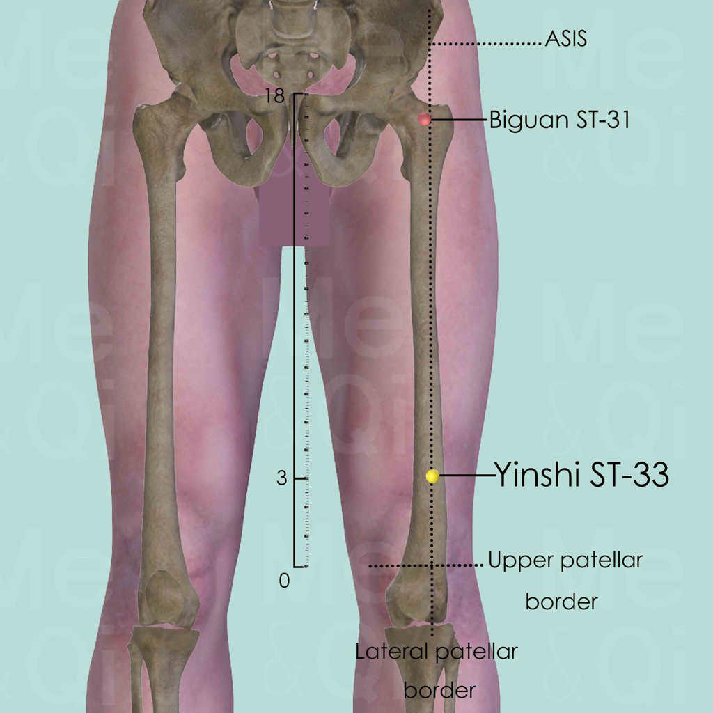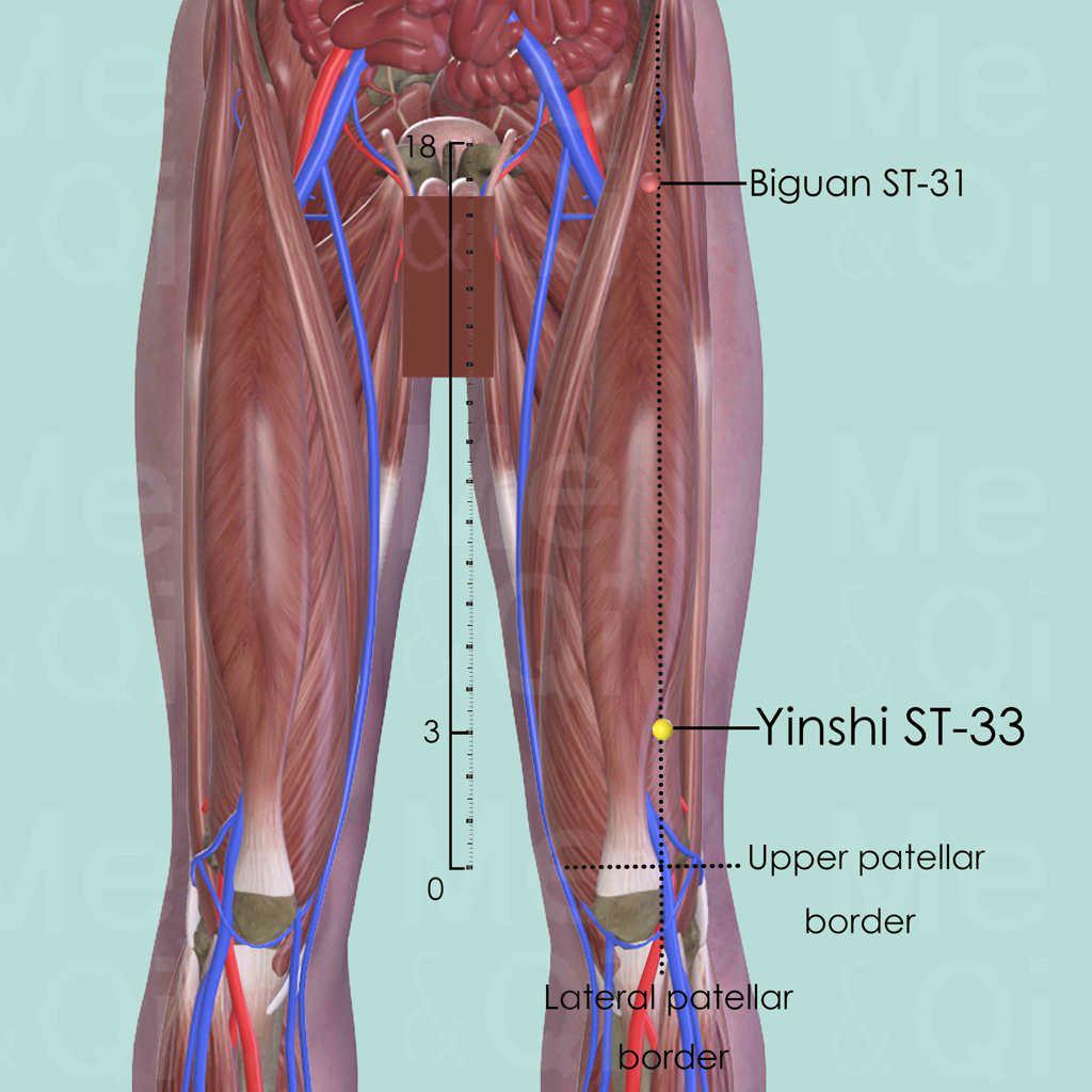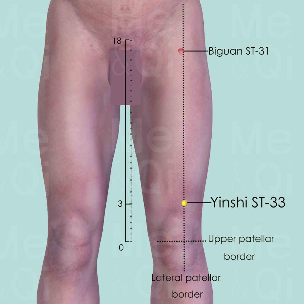 Similar to its neighboring points of Biguan ST-31 and Futu ST-32, Yinshi ST-33 is also indicated for Painful Obstruction Syndrome, Atrophy Syndrome or sequelae of Wind-stroke, particularly of the legs.