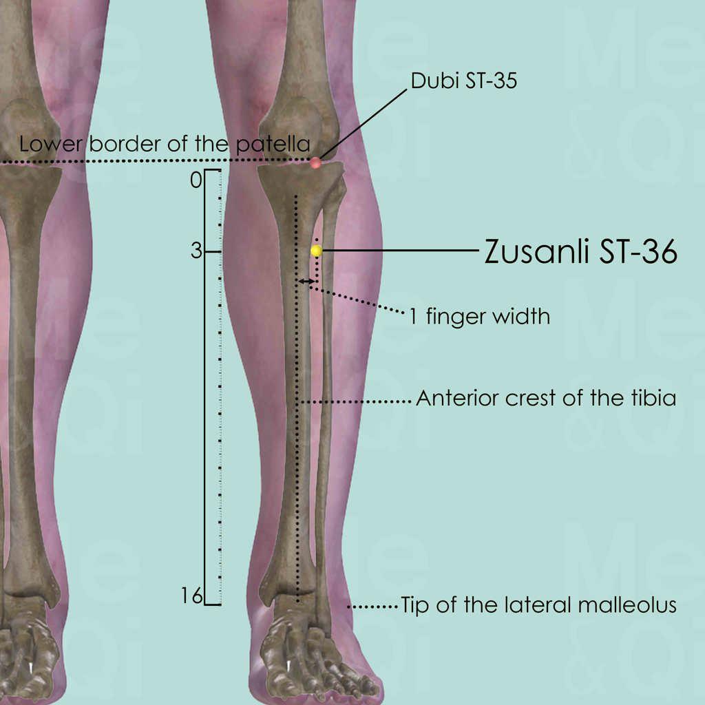 Ma Dan Yang's Heavenly Star Points Song: "Zusanli is located three cun below Xiyan (Extra) and between two tendons. It can get to the heart of abdominal distension and is good for the treatment of cold sensation in the stomach, intestinal noises and diarrhea, swollen leg, soreness in the knees."