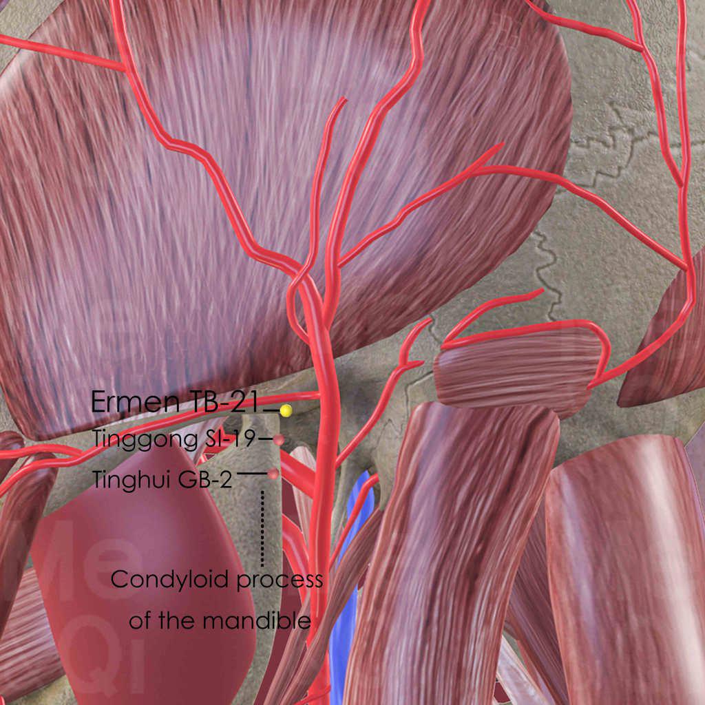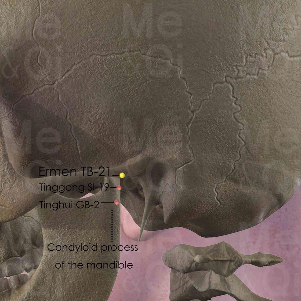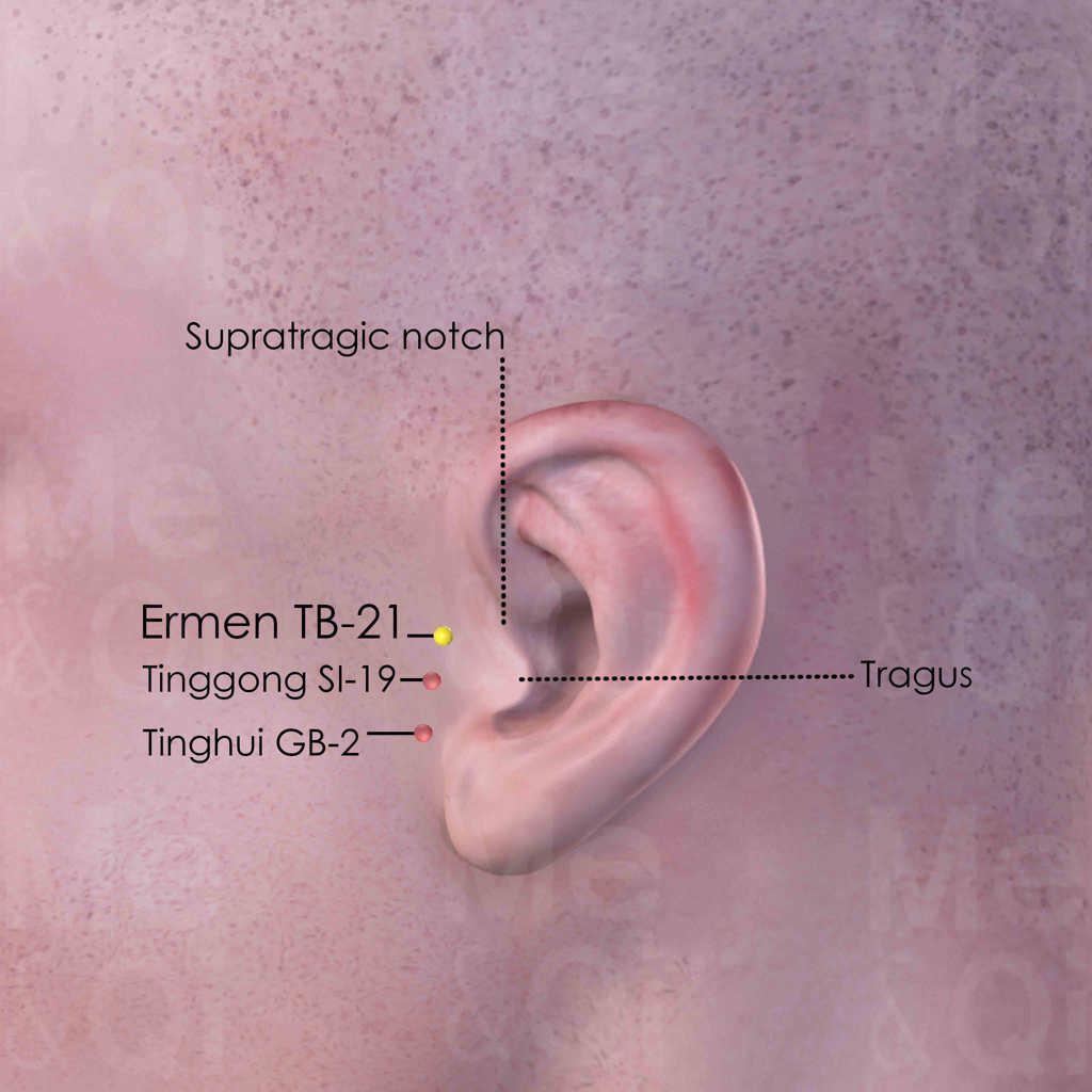 In the depression anterior to the supratragic notch and slightly superior to the condyloid process of the mandible. The point should be located and needled with mouth open. Tinggong SI-19 and Tinghui GB-2 are located below Ermen TB-21.