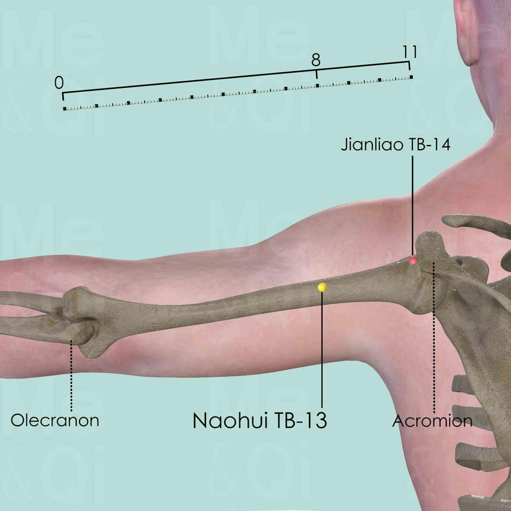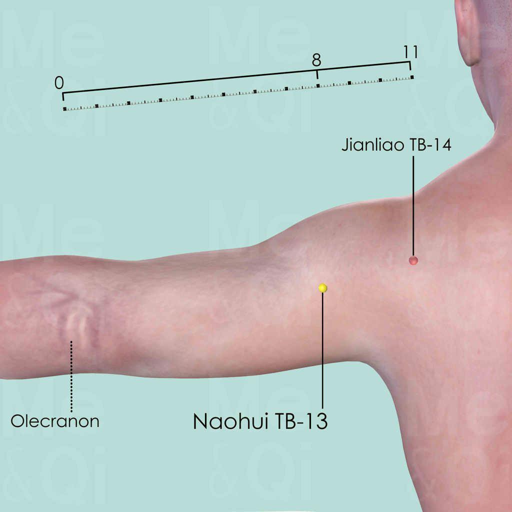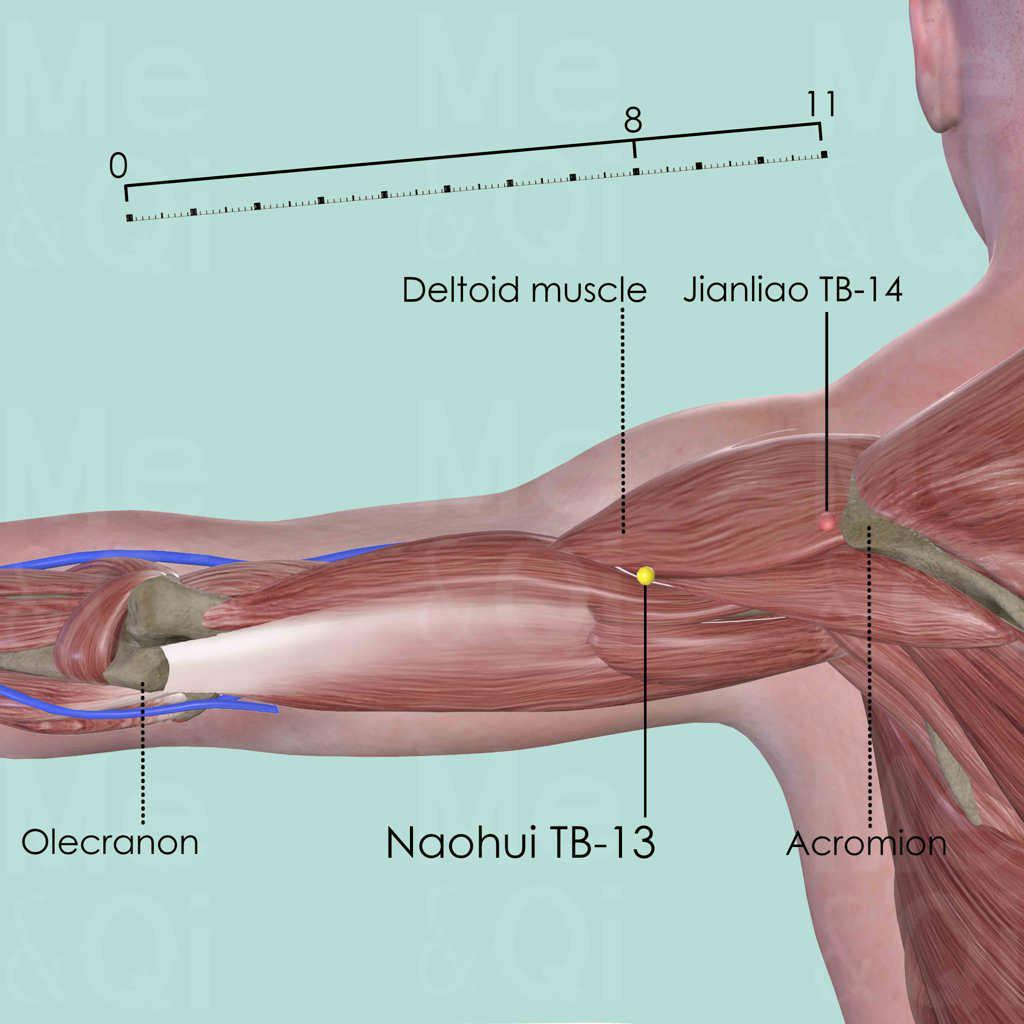 On the line joining Jianliao TB-14 and the olecranon, 3 cun below Jianliao TB-14 which is at the lateral extremity of the acromion. Naohui TB-13 is on the posterior border of deltoid muscle.