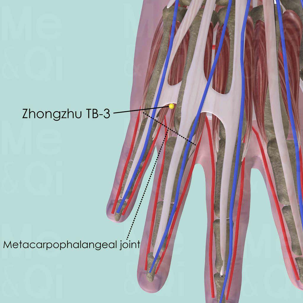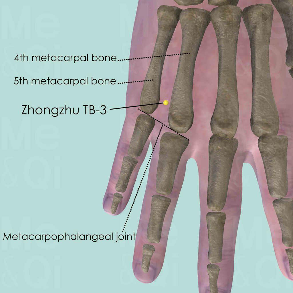 When the hand is placed with the palm facing downward, Zhongzhu TB-3 is on the hand dorsum between the 4th and 5th metacarpal bones, in the depression proximal to the metacarpophalangeal joints, at the junction between the heads and shaft of the two metacarpal bones.